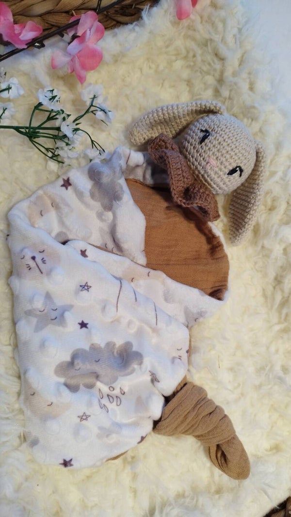 Ce lapin n'est pas un simple doudou, c'est un compagnon de sieste, gardien de secrets, un petit souffle de nature qui suit bébé partout, du berceau à la poussette. Léger et facile à manipuler, il est adapté dès la naissance.