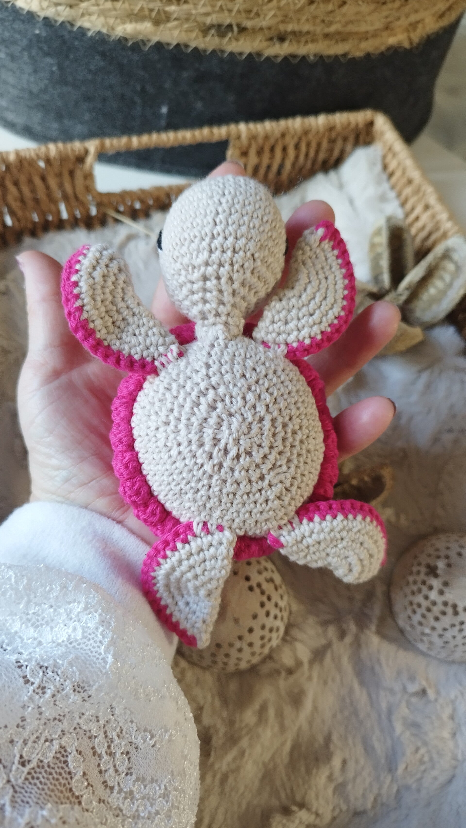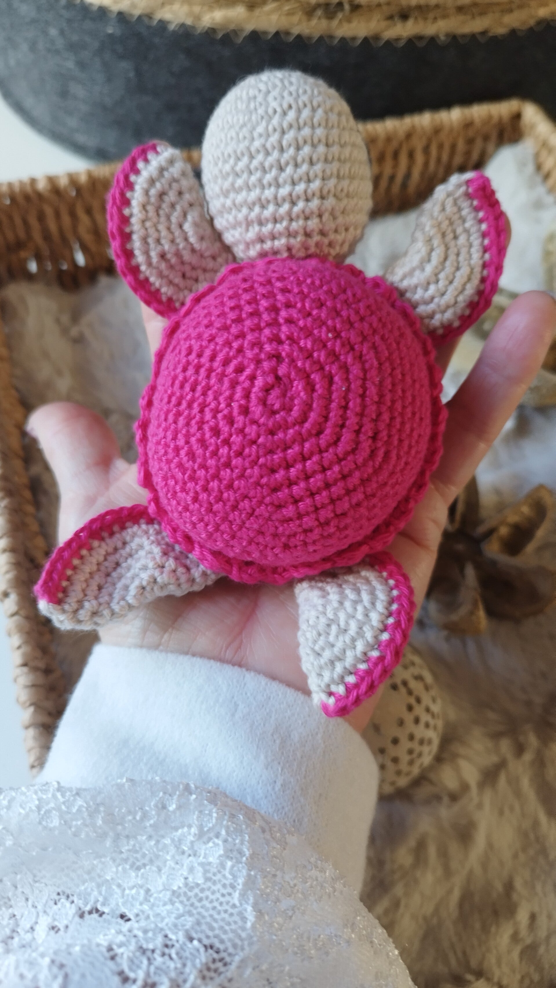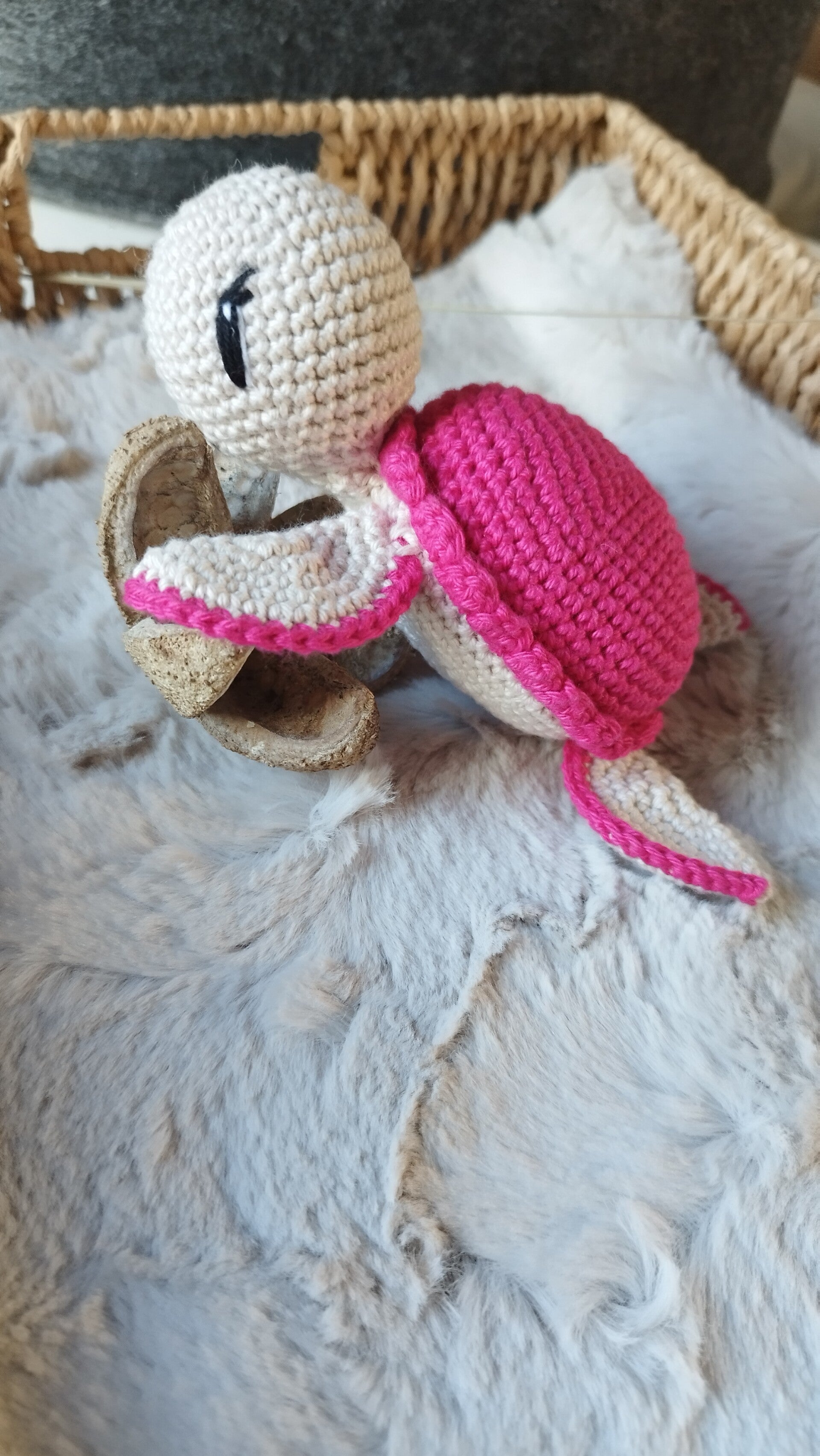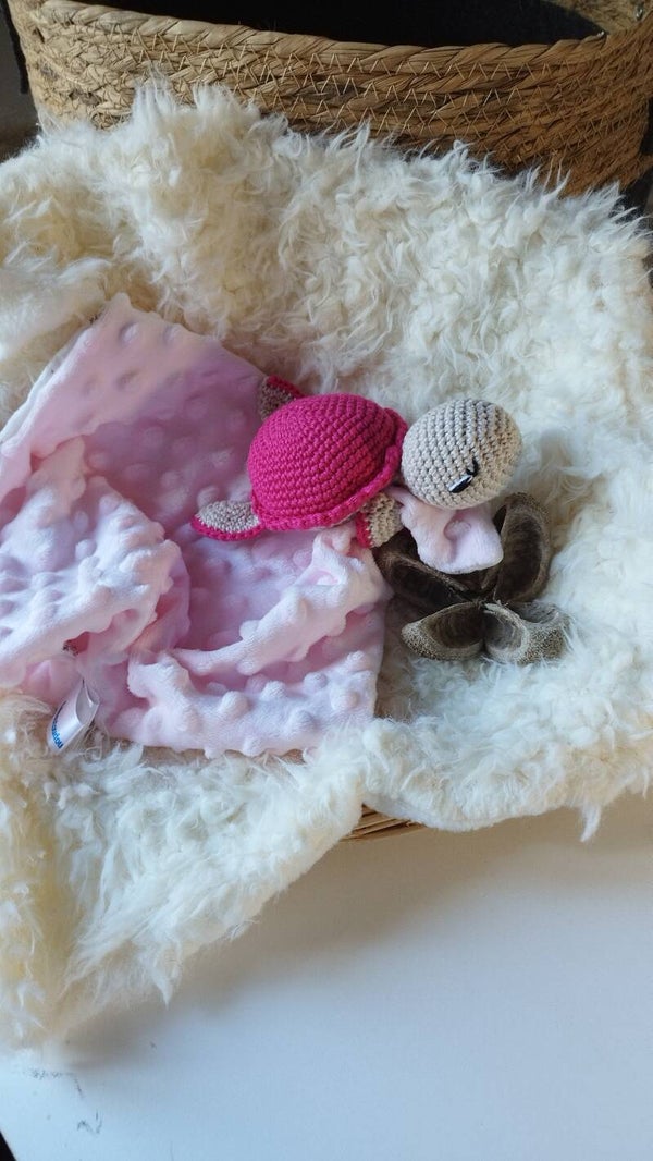 Rosie est un doudou tortue réalisé au crochet.